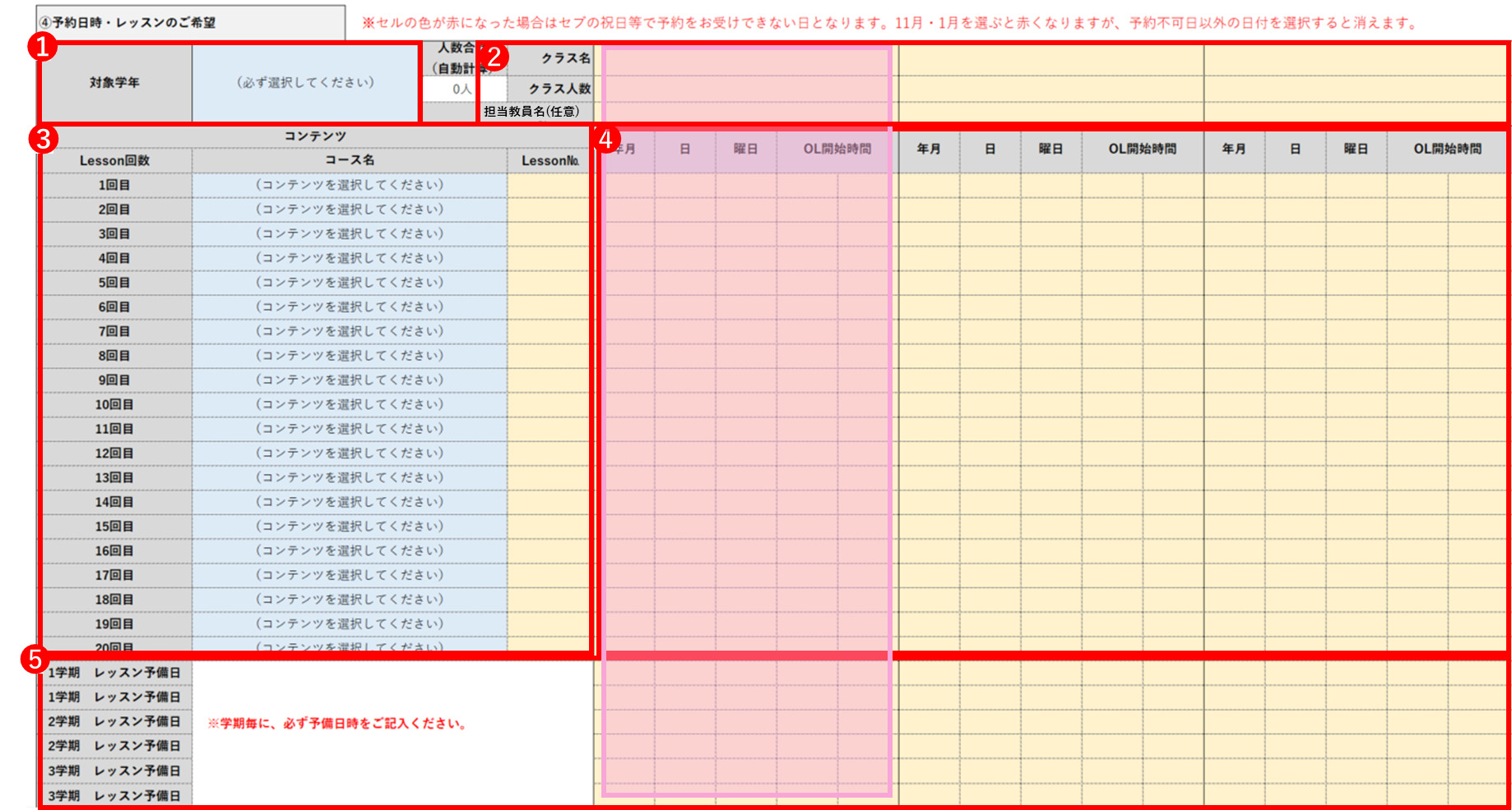 - ピンク色の枠の5列がクラスごとの予約日時を入れる部分となっています。